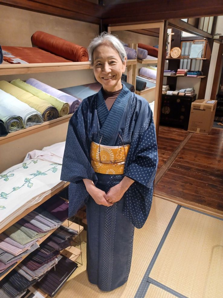 This is Kyoko. Her shop specializes in kimono. She custom makes kimono, tailored to fit each of her clients using materials and designs of their choosing.