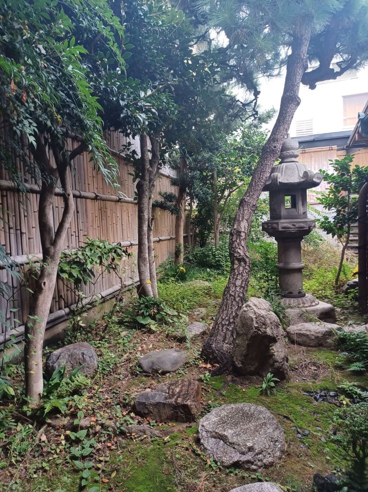 Following this, it came time to pay up. This was a more complicated process than I was able to understand. Kyoko called in two associates to figure it out. I enjoyed watching as they weighed the cloth materials on a small scale, carefully balancing them. While they were at it I went out to sit in their beautiful Japanese garden.