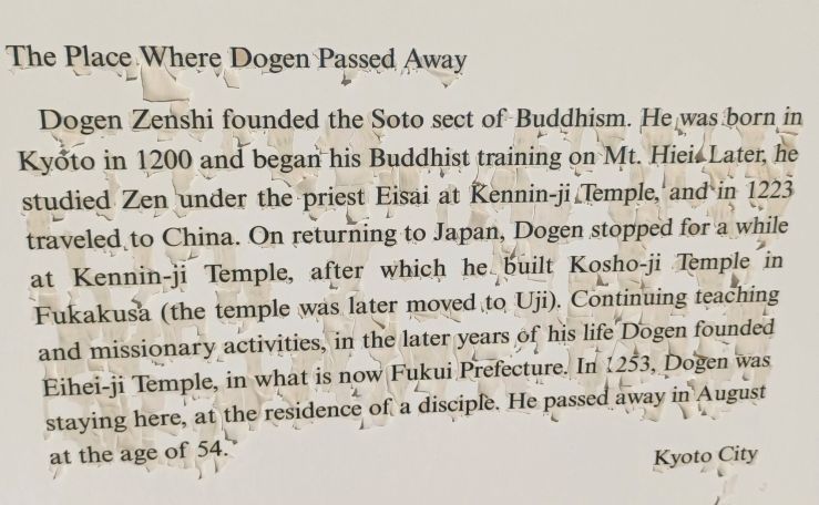 I did not know this was here and didn’t go looking for it. While searching for something else on Google Maps, I saw these words, in red: “The place where Dogen passed away.” I went to pay my respects.