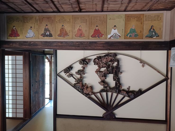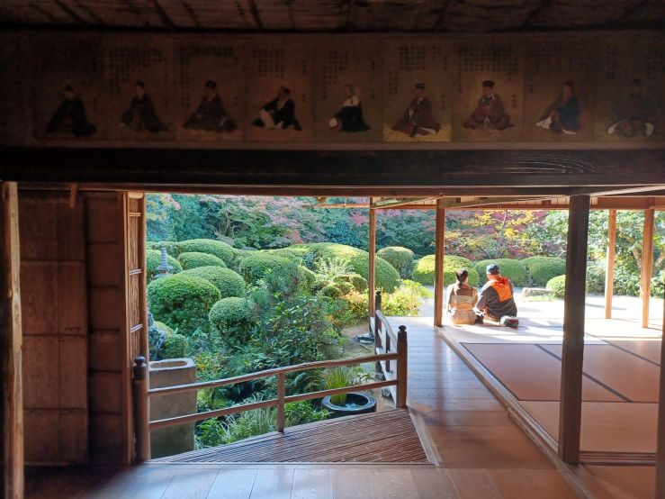 The nine seated images are said to represent poets of China, those who greatly influenced Japanese poetry and writing. There are thirty-six such images on the four walls of this, the poet’s room. The founder, Ishikawa Jozen, wrote his own poems on each of the images. For near four-hundred years they have been in their places.